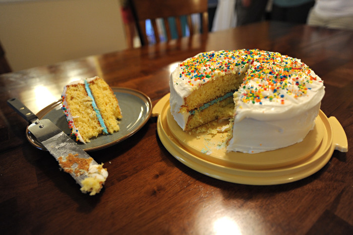 We are so excited to announce that Natalie is having a little brother come November! We had our “Baby Cakes” party last Wednesday after having the big ultrasound earlier that day. The tech sealed the gender in an envelope which we then took to a friend who frosted the middle layer of our baby cake with pink or blue. The outside of the cake was just white, so it wasn’t until we cut the cake that we found out it’s little Tyler in there!!