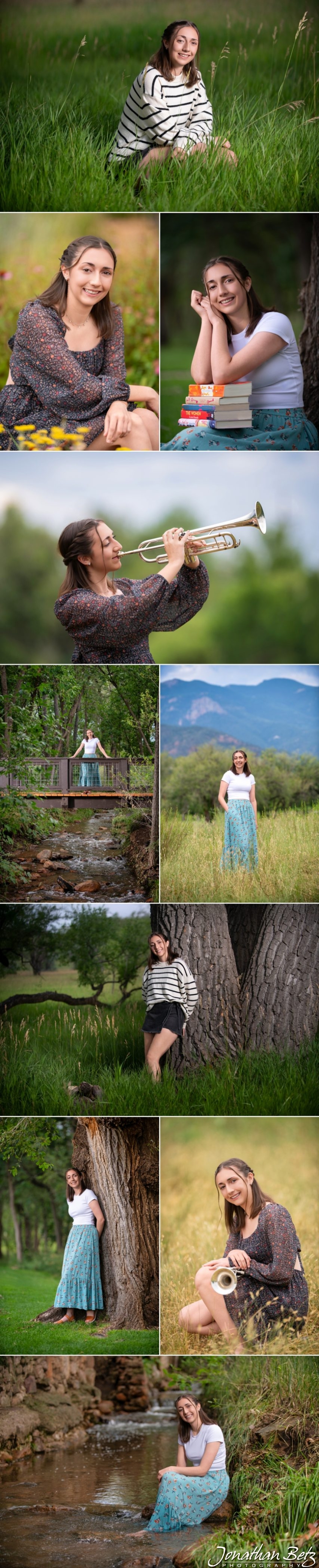 It was so nice to have this family return for these beautiful senior portraits for daughter Grayce. This senior wanted to capture all the natural beauty that Colorado has to offer….and we were able to get a variety of backdrops in these stunning Bear Creek portraits! Grayce also wanted to include some of her favorite passions like reading and trumpet, as marching and jazz bands have been an important part of her Pine Creek High School experience.